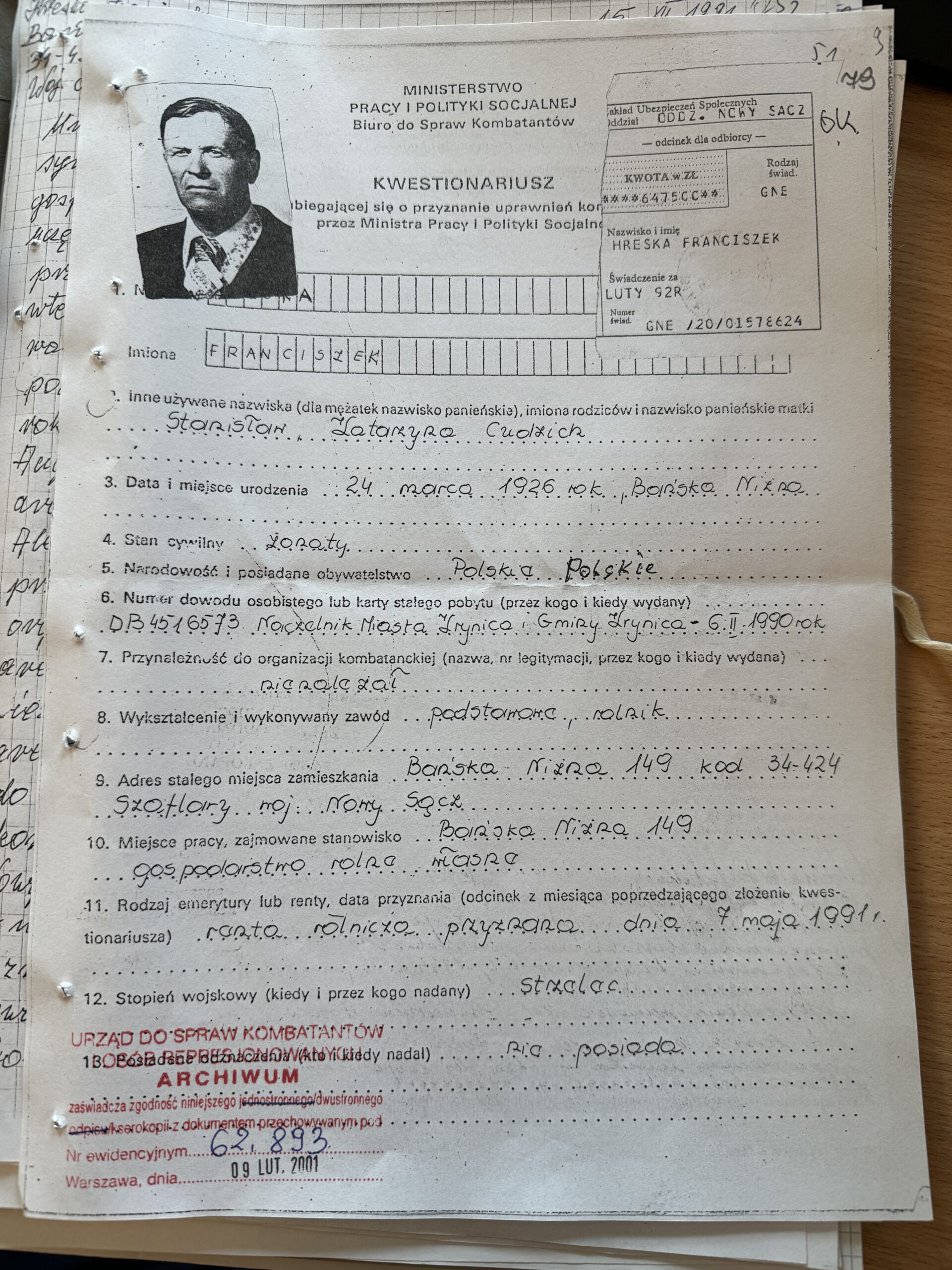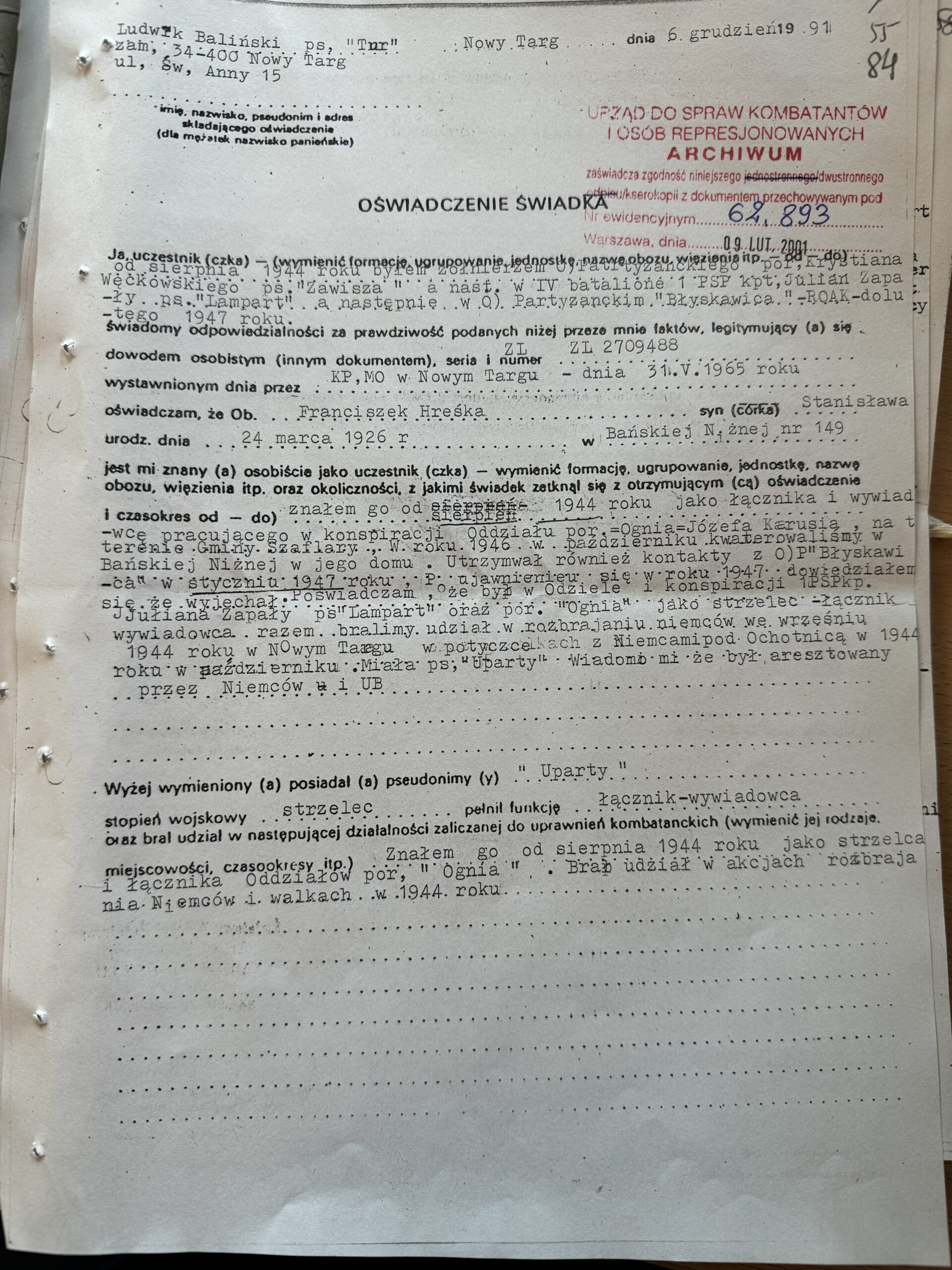 Wątpliwy żołnierz „Ognia” „Uparty” – któremu państwo pomimo wielu starań odmówiło odszkodowania za walkę o niepodległy byt państwa. Na jego nagrobku widnieje napis żołnierz AK -co jest nieprawdą, gdyż nigdy w niej nie walczył. To następny mitoman „Ognia”, który z tego tyłu czerpał wiele korzyści. Właściwie w życiorysie poza jednym wyjątkiem nie podaje swoje pseudonimu – co jest najbardziej istotne. Nie walczył ani u „Lecha”, ani u „Zawiszy”, ani u „Lamparta”. Ogniowcy starajacy się o kombatanctwo w AK zawsze podawali nieprawdziwe dane poświadczone przez nich samych.